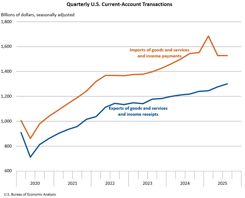 The U.S. current-account deficit, which reflects the combined balances on trade in goods and services and income flows between U.S. residents and residents of other countries, narrowed by $22.8 billion, or 9.2 percent, to $226.4 billion in the third quarter of 2025, according to statistics released today by the U.S. Bureau of Economic Analysis. The revised second-quarter deficit was $249.2 billion.